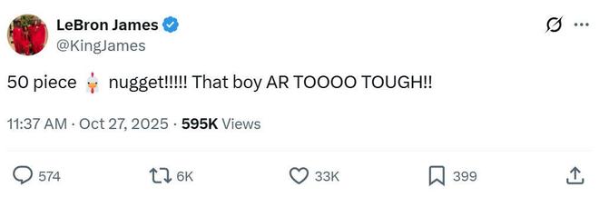 期间还不忘调侃前一场错失50+的东契奇,詹姆斯写道:“太疯狂了,我们的后场双人组差一点就拿下连场50+,都怪你东契奇,我们的后场双人组太棒了!”